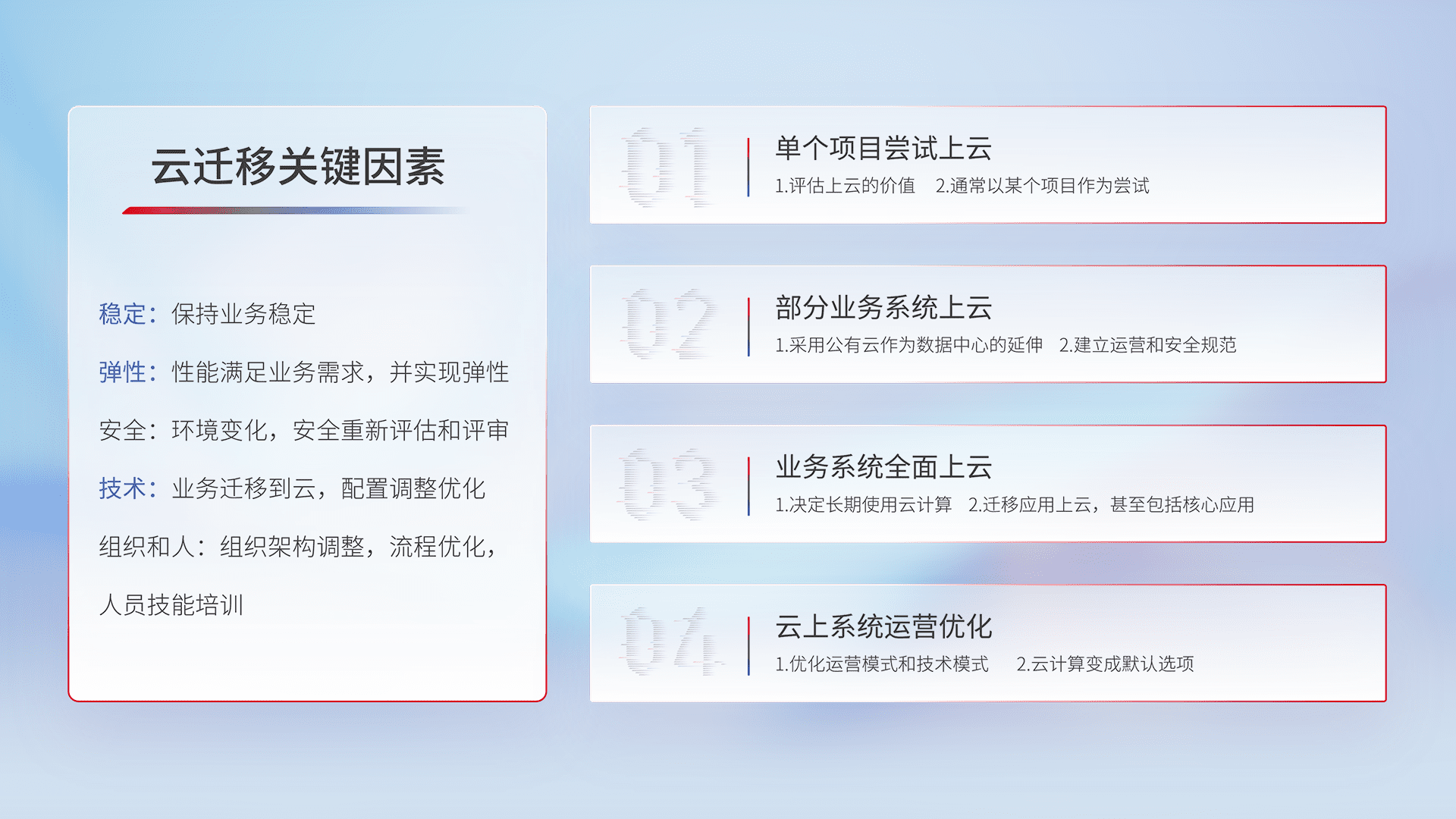 结合实际业务,,,,从规划设计、、云平台选型、、云原生改造、、、、数据迁移、、、集成交付,,迁移全过程为客户识别最佳上云路径,,,,做好风险识别管理,,设计网络架构、、、、身份权限、、安全审计合规、、、、操作审计、、日志审计、、监控告警策略、、、、多站点容灾设计等,,,对云上基础设施进行整体规划,,提升IT治理水平,,以满足弹性、、、高可用、、、高性能的需求。。。